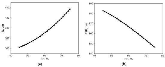 As mentioned earlier, the change in radius of the glycerol droplet is the main parameter causing wavelength shift. When approaching higher RH levels, the radius increases exponentially. Thus, the sensitivity of the sensor also increases. In our experiments in the 45–75% RH range, the radius increased by 19% (Figure 8a). Glycerol solution has a known water/glycerol ratio for every RH level, which determines the refractive index. Additionally, each glycerol solution droplet at a specific RH has a unique radius. The volumetric expansion of this type of resonator is more significant than that of solid resonators with coating, making our resonator more sensitive. To make use of this property, the coupling position needed to be frequently adjusted. In future research, the measurement chamber can be made more compact and the coupling method can be adapted to create a sensor that is even easier to set-up and use. Tapered fiber can be used to induce resonances [42] and to keep the coupling position and the droplet stationed itself.