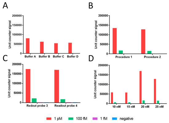 Results for the optimization of the rolling circle amplification. The results are shown as bars including the Unit counter signal. (A). Hybridization buffer optimization. (B). Labelling temperature optimization (Procedure 1: incubation at 75 °C for 2 min + 37 °C for 45 min; Procedure 2: incubation at 37 °C for 45 min); (C). Readout probe sequence. (D): Readout probe optimization. Further experimental details can be found in the main text. In all instances, the negative control without the DNA template, were performed (blue bar).