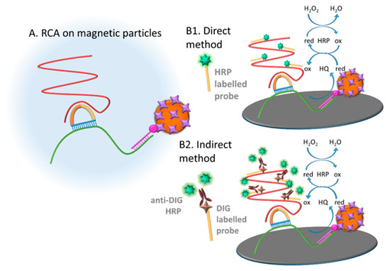 Figure 5 shows schematically the different approaches (direct and indirect) for the labelling of the rolling circle amplification products (RCPs) for the subsequent electrochemical readout.