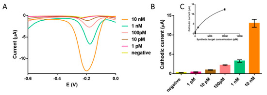 To determine the performance and limit of detection (LOD) of the RCA on streptavidin-MPs, the electrochemical genosensing was performed on a serial dilution of 16s ribosomal E. coli synthetic target, ranging from 1 pM to 10 nM (10 amol to 0.1 pmol), and detected by square wave voltammetry. The results are shown in Figure 7.