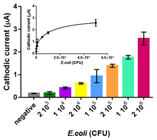 Finally, the electrochemical genosensor was evaluated for the detection of E. coli. The samples were treated according to the experimental section. Figure 8 shows the maximum signal obtained in the voltagramms for the E coli. The LOD was found to be 3 × 103 CFU in 10 µL of sample, corresponding to 104.3 CFU mL−1.