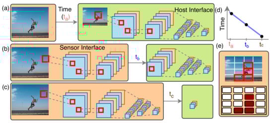In contrast, high-level processing tasks like convolutional neural networks (CNN) require massive operations, and we initiate that processing at the cloud while the sensor works as a passive device. In that case, a camera collects pixels and then transfers every pixel to the cloud sequentially, which is shown in Figure 1a [6]. The pixel values propagate to the server through a channel that requires time ta. Here, both data dimensionality and propagation time increase with the increase of image size. The bandwidth constraint acts as a bottleneck for high-speed operations and creates a privacy concern. Some of the computations are performed at the sensor with a focal-plane sensor processor (FPSP) to improve the scenario [7]. The performance of the FPSP is limited to low-level functionalities. It increases the efficiency of edge-cloud collaboration. Edge-cloud collaborative computation is an excellent step to push computation at the edge [8]. Here, computational methodologies have been investigated where the signal processors in the sensor are assigned to perform more computationally expensive operations like convolution, and the host device performs the remaining function (see Figure 1b). Though the image size decreases after convolution, the number of channels increases, which further raises the image data volume. Therefore, the communication channel between edge and host still refrains us to exploit the maximum bandwidth available at the sensor interface.