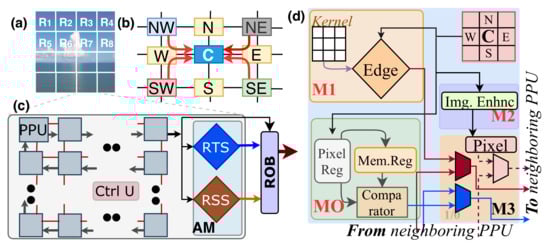 Figure 5d depicts every module in the PPU. The M0 module has a pixel and memory register array to store the pixel values for a specified window at the time t and (t − 1), respectively. If the comparator finds a notable change that is greater than a threshold in the window, then it gives one as output to module M3 and updates the memory register. The value one represents that the pixel has temporal saliency (TS). Alternately, the M1 module determines the spatial saliency (SS) associated with the pixel using the Sobel edge detection algorithm. According to Figure 5d, M1 has the convolutional kernel to determine whether the pixel lies on edge. M1 gives one as SS score if the pixel lies on edge and zero otherwise. Simultaneously, the M2 module performs image enhancement applying the Gaussian smoothing function. It helps to remove noise from an image.