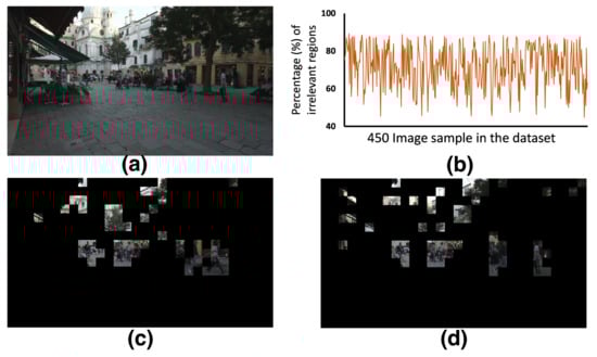 (a) An original image in MOT17-SD1 dataset [31] (b) Percentage regions with Temporal redundancy in the dataset (c,d) image regions without redundancies (effective data volume is very low).