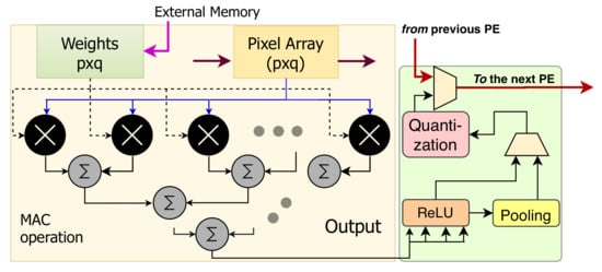 Block diagram of the Processing Unit (PE). It performs MAC operations, rectification, pooling (when required), and quantization.