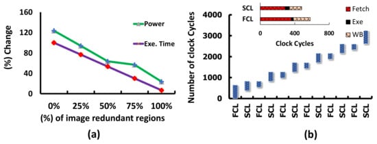 We have seen that the APL brings the advantage of saving power and time, and now we quantify the benefit for some images with different percentages of redundancies. Figure 11a represents the results with five images where the number of redundant regions varies from zero to a hundred percent. In the Y-axis, we present the performance of the HARP architecture with and without the APL layer. The HARP without the APL layer performs execution continuously, but with the increase of redundant regions, both execution time and latency go down. When there is 0% redundant information, this architecture with the APL layer draws more power and needs more time. However, we have discussed in Section 3.1.2 that the overall natural image has huge redundant information. Execution time drops by 70.1% with 25% relevant information when we apply attention-oriented processing. This processing also saves significant power, as illustrated in Figure 11a. For example, if every region is redundant, power consumption drops by 76.34%. As a result, the power consumption and latency are always lower when we consider attention-oriented hierarchical processing. Therefore, the APL integration in the HARP is crucial for accelerating vision applications in resource constraint edge devices.