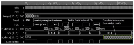 From the delay analysis in Table 5, we can visualize that the design spends more time in the inference engines. The delay in the ICL layer increases with the increase of convolutional layers and channels in each layer. Hence, an efficient pipeline is required to increase the processing speed. Figure 12 presents some of the simulation results to illustrate the pipeline processing, and Figure 11b demonstrates the clock cycle-based presentation of FCL and SCL. In Figure 11b, X-axis represents the FCL or SCL’s repeating operation, and the Y-axis shows that clock-cycle. An RPU takes 359 clock cycles to determine a region’s saliency and makes the load “true” for the ICL. When the load becomes true, the FCL starts fetching data from that region and executes the first output channel. When the first channel data is available then the SCL initiates execution (see Figure 11b and Figure 12). Time requirements associated with image fetch, execute, and writeback for FCL/SCL are presented in the inscribed Figure 11b. The initial pixel acquisition time for the FCL is longer and takes 359 clock cycles to populate the PEs, which is 1.81× faster than the conventional streaming process. The SCL also achieve this speedup to read 256 data and populate 196 PEs by 288 cycles. The FCL remains unused for a certain period of time, and we update weights in the weight-buffer for the MAC operations to make the design more efficient. In addition, we also illustrate in Figure 11b that the FCL always makes partial data ready to avoid stalling in the SCL. The SCL takes the output from FCL to produce a partial result and then performs writeback in the last iteration when the complete feature map becomes ready. Therefore, HARP architecture executes does not require accessing the off-chip memory to execute the second convolutional layer. Hence, this pipeline exhibits an additional acceleration by minimizing the dependency with the off-chip memory.