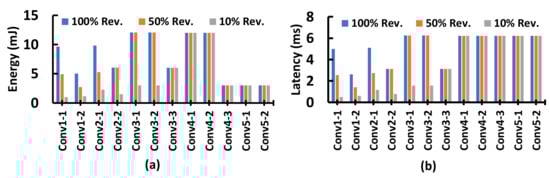 (a) Energy consumption at the different stages in the processing hierarchy. (b) Time required to perform computation at every stage for the VGG-16 model. The analysis is made under three different 100%, 50%, and 10% relevant regions.