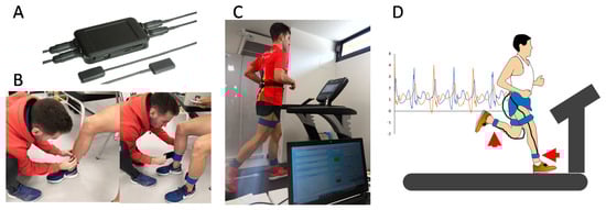 Graphical schematic of the body-worn accelerometer fixed to athletes: (A) Accelerometry system (AcelSystem, Blautic); (B) accelerometer fixation on distal and anteromedial portion of each tibia; (C) final experimental setup; and (D) graphical representation of the accelerometer signal and the experimental setup.