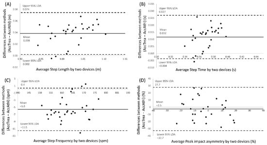 Bland–Altman plots representing comparisons between the AccTrea system and the AccAthl system for four of the variables analyzed: (A) Step length; (B) step time (duration); (C) step frequency; and (D) peak acceleration impact asymmetry. The mean line represents the mean difference between the devices, with the upper and lower dashed lines representing the 95% limits of agreement (LOAs).