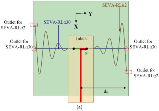 The feed structure consists of parallel strips connected to the meandering microvascular elements of the antenna through antipodal dipoles; this also forms a balun-like transition [30]. Equations (1) and (2) provide the parameterization of the sacrificial PLA used to create microvascular channels for the ML-SEVA in Figure 1. These meander outward in the y-dir. starting from the feed location y = ±s0 = ±10.0 mm and to y = ±d0 = ±72.2 mm and are modulated sinusoidally in the x-dir. with a period p0 = 2 within a power series envelope with a growth parameter α. In this work, the first vascular network in the lay-up uses α = 2 to provide a sinusoidally-meandering dipole antenna topology referred to as the SEVA-RLα2. The vascular network on the layer below uses α = 30 to form a quasi-linear dipole-like antenna referred to as the SEVA-RLα30. The parameter t in these expressions denotes the location of liquid metal, or length of meandering along y-axis in SEVA, and the terms t1 and t2 (used later) denote the channel filling parameter in SEVA-RLα2 and SEVA-RLα30, respectively.