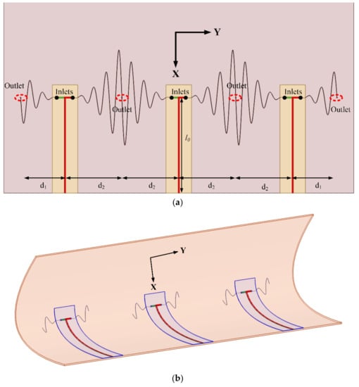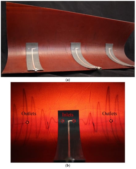 The topology and operation/role of the feed network for this structure is similar to the structure presented in Figure 1. Its 50 Ω impedance parallel strip feed lines have a length l0 = 5.78 in. (147 mm) and is fabricated on 31 mil (0.7874 mm) thick RT/Duroid 5880 (εr = 2.2 and tan δ = 0.0004); this is used in place of the FR4 substrate to provide a feed network that can conform to the curvature of the composite. Figure 3 (top view) shows three feed elements connected to the sinusoidally meandered dipoles. Figure 3 (side view) shows the detailed connection between feed and embedded microvascular channels.