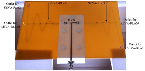 Cylindrical metallic tubes with a diameter of 2 mm are soldered to the feed and visually aligned with the opening on the embedded channels in the substrate to ensure continuous and leakage-proof flow of liquid metal from inlets towards the outlets. This also establishes electrical connection between liquid metal in the embedded channels and the feed. Additionally, for mechanical stability, the feed is affixed to the substrate by nylon screws ensuring a tight fitted connection between the feed and the substrate. Filling the embedded channels with non-conductive, low-loss, low dielectric, and heat transfer fluid Fluorinert FC-70 [38] electronic liquid before flowing liquid metal ensures smooth flow of liquid metal in the channels. When liquid metal is transported from the inlet of SEVA-RLα2 towards its outlet the outlet of SEVA-RLα30 is sealed with hot melt adhesive (HMA) to avoid leakage of liquid metal into the undesired channel. Similarly, the outlet of SEVA-RLα2 is sealed with HMA when liquid metal is transported through SEVA-RLα30.