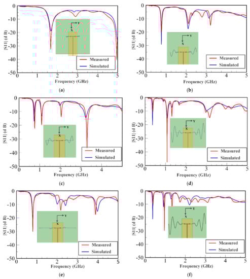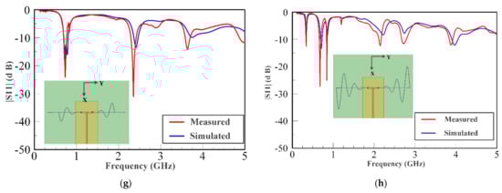Measured and simulated S-parameter values (|S11| (dB)) for different scenarios. (a) t1 = 0.8 in. and t2 = 0.8 in. (b) t1 = 1.6 in. and t2 = 0.8 in. (c) t1 = 1.6 in. and t2 = 1.6 in. (d) t1 = 2.4 in. and t2 = 1.6 in. (e) t1 = 1.6 in. and t2 = 2.4 in. (f) t1 = 2.4 in. and t2 = 0.8 in. (g) t1 = 1.6 in. and t2 = 2.4 in. (h) t1 = 2.4 in. and t2 = 2.4 in.