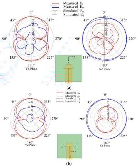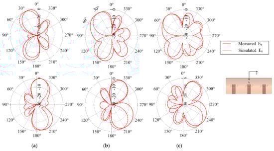 Figure 5 shows the measured and simulated input reflection coefficient (in dB) for the chosen combinations of t1 and t2. The plots clearly demonstrate down shift of fundamental mode resonant frequency with increasing liquid metal flow in the embedded channels. These plots illustrate that the radiation pattern of the antenna remains quasi-omnidirectional for the different configurations. The close agreement observed between the measured and simulated results indicates that the operation of frequency reconfigurable ML-SEVA is also stable across the range of frequencies considered in this work. Figure 6 shows the measured and simulated Eθ and Eφ in xy- and xz- planes at the lowest value of magnitude (in dB) for the fundamental mode. When the antenna resonates at a frequency closer to the antipodal dipole (around 4 GHz) used to feed the microvascular component the antenna, the radiated pattern deviates from expectations due to increase interactions with the parallel strip feed network and other artifacts of experimental set-up. Thus, higher volume of metal in the embedded channels offers stable radiation pattern compared to lower metal volumes in the channels as with higher metal volumes in channel the antenna resonates at frequencies much lower than 4 GHz. Simulated maximum gains for configurations in Figure 6a–d is 2.3, −0.01, −3, 1.7, and −5 dBi, respectively.