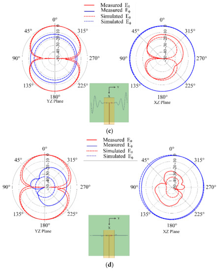 Measured and Simulated radiation pattern in yz- (left) and xz-planes (right) for different scenarios (a) t1 = 0.8 in. and t2 = 0.8 in. at f =1.681 GHz; (b) t1 = 1.6 in. and t2 = 1.6 in. at f = 0.74 GHz; (c) t1 = 2.4 in. and t2 = 0.8 in. at f = 0.372 GHz; and (d) t1 = 0.8 in. and t2 = 2.4 in. at f = 0.8 GHz.