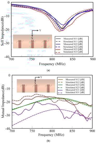 Measured and simulated impedance results of multi-element SEVACLA at 824 MHz for channel filling variable, t = 1.55 in (a) Self-impedance of the array elements (b) Mutual-impedance of array elements.