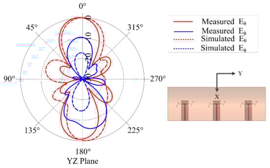 Figure 8 shows the simulated and measured input reflection coefficient of the multi-element SEVA-CLA with a filling of t = 1.55 in. in each arm of sinusoidal meandering, operating at 824 MHz as shown in Figure 3b. A subset of the mutual impedance measurements of multi-element SEVA-CLA are compared. This configuration is chosen such that the center of the matched impedance bandwidth of the antennas (when filled with liquid metal) would provide a half-wavelength element spacing in the array. Operationally, at frequencies higher than this (when the dipole arms contain less liquid metal) the spacing become much greater than a half-wavelength and the pattern behaves as expected with the generation of grading lobes and other features. The radiation pattern of SEVA-CLA with zero-degree relative phasing between the elements is shown in Figure 9. Beam scanning by the array in the yz-plane is shown in Figure 10. Maximum beam scanning range of the array is within ±45 degrees. The principal beam of the array can be scanned by varying the progressive phase shift between the elements of the array. The phase difference between the antenna elements is varied by connecting microstrip transmission lines with pre-determined phases at 824 MHz.