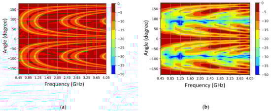 Simulated variation of radiation pattern with frequency (a) 3-element isotropic elements spaced 183 mm apart and (b) multi-element SEVA-CLA spaced 183 mm apart.