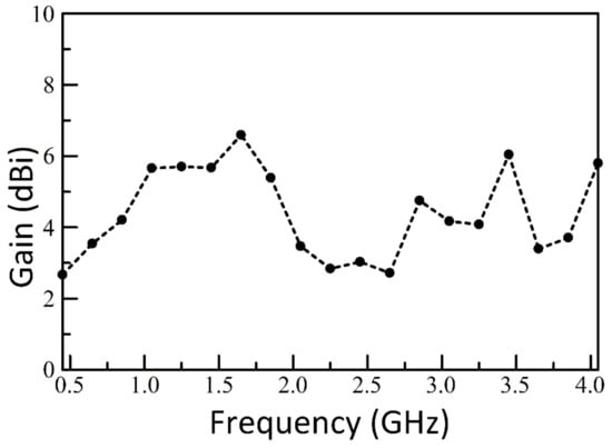 The contour plot in Figure 11 shows the array pattern for three isotropic elements spaced 183 mm apart and the three element SEVA-CLA with uniform excitation over a nominal operational bandwidth from 0.45 GHz to 4.05 GHz. The overall array pattern for multi-element SEVA-CLA is obtained by multiplying the single elemental pattern of multi-element SEVA-CLA with the array pattern of similarly spaced isotropic source. Careful examination of the two normalized gain plots testifies that the gain pattern of SEVA-CLA is obtained by multiplying the gain pattern for three-element isotropic array with the unit element pattern shown in Figure 11. Additional nulls at ±90 degrees in the SEVA-CLA contour plot are introduced by the individual elemental pattern of multi-element SEVA-CLA. The position and distribution of maxima at 0 degrees and grating lobes are similar between the two plots. Increase in the number of grating lobes in the visible region at higher frequencies is due to the widening gap between individual elements in terms of wavelength. Figure 12 shows the gain distribution of SEVA-CLA over similar frequency range (0.45–4.05 GHz). The variation in the gain pattern is attributed to the coupling between the elements with different filling factor, t, over the frequency range. The gain of SEVA_CLA observes a dip around 2 GHz as the grating lobes start to emerge in the visible range. The efficiency of the SEVA-CLA could not be measured experimentally in the facility due to lack of available tools or in simulation but a decrease in efficiency is expected to be seen with increasing grating lobes [39].