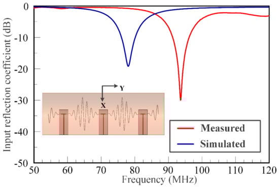 Figure 13 shows the measured input reflection coefficient for another unique configuration of the SEVA-CLA. This corresponds to the complete filling of embedded microchannels with liquid metal. The central element is driven in the configuration shown with the other two ports terminated in open circuits—this is one of many unique configurations that can potentially be achieved using different reactive loads and feed locations. In the form shown, the contiguous antenna structure operates as single antenna element with a matched impedance bandwidth centered at 95 MHz. The shift between measured and simulated input reflection coefficient is attributed to differences arising from fabrication and processing as well as other variations between modeled and fabricated designs.