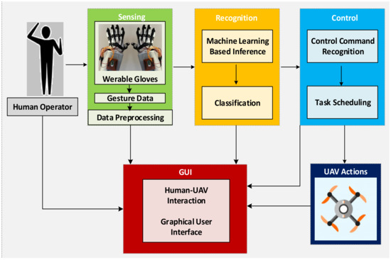 The proposed architecture for hand movement prediction and UAV guidance through an intelligent pair of gloves consisting of the sensor systems, the recognition system, the control system, the GUI (Graphical User Interface), and the part where the user controls the UAV’s movements.
