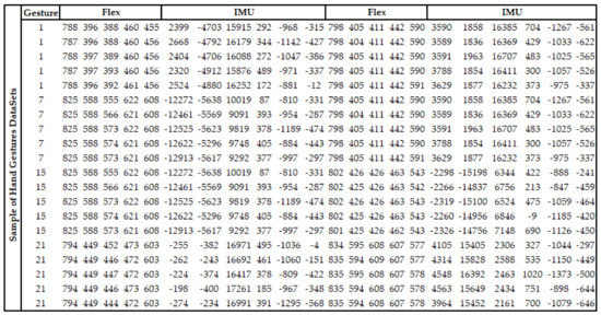 In this study, a data set was created from the data obtained via flex and IMU sensors on a wearable smart glove. The data set used to recognize hand gestures consisted of 49000 data obtained from 20 different users between the ages of 22 and 63 (both men and women). Four sample gesture data (gesture 1, gesture 7, gesture 15, and gesture 21) shown in Figure 3.