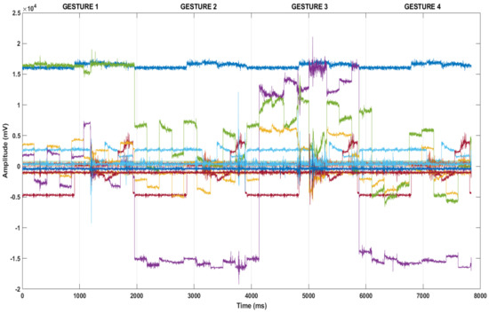 An example of a signal graph that occurs when 4 consecutive hand movement scenarios occur for approximately 2000 ms.
