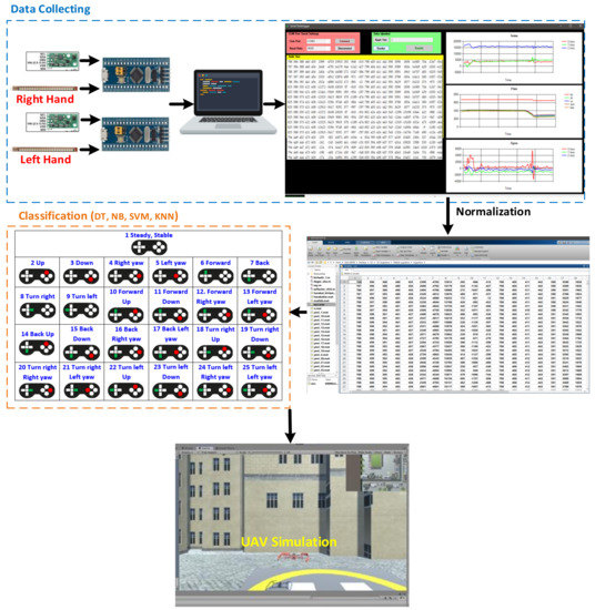 Gyro and acceleration sensor signals on the IMU, in addition to the flexibility sensors corresponding to hand gestures, are graphically shown in our application. These graphics can be followed in real-time during the application. To avoid distortion during the beginning and end of the motion, data from the first and last 3% of the signals received from the human operator were removed. The signals received in the gloves were pre-processed and converted into digital data. To create a data set of digital values and then teach the system in the classification section, saving was performed according to the location and file type determined through the application. A normalization process was carried out to purify these data of repetition, and then the data set to be used was obtained. For the data set obtained, 4 different classification algorithms were applied to make machine-learning-based inferences. The mission planning of the multi-mode commands corresponding to the hand gesture control definition class determined as a result of the classification process was transferred to the UAV simulation developed in the Unity environment via a GUI.