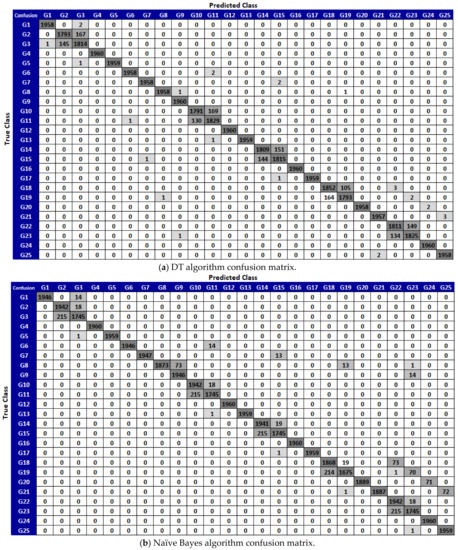 Prior to classification, data were collected preserving 10 s per movement. To ensure the quality and accuracy of the motion signals, 3% of the data in the first and last parts of the received signals were removed since the user had to clearly complete each hand movement. Confusion matrixes were obtained by running 100 iterations of the decision tree (DT), naïve Bayes (NB), support vector machines (SVM), and K-nearest neighbors (KNN) algorithms, whose parameters are given in Table 2. The confusion matrices obtained as a result of the 25 different motion-based DT, NB, SVM, KNN algorithms are given in Figure 7.