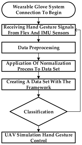 In this study, a real-time approach was implemented using a smart pair of gloves to facilitate machine-learning-based human–UAV interactions. The sensing operating combination gloves were designed to be flexible and wearable to provide a safe, comfortable, portable, and affordable solution. A flow chart of the process realized in the background with the user wearing the glove and starting to use the system is shown in Figure 9.