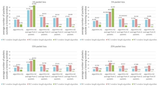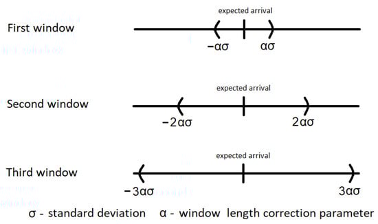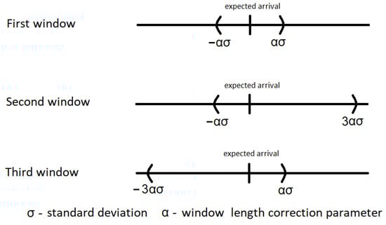 - Window size adjustment algorithm based on the transmitter’s clock deviation with the continuously calculated probability of the window elongation (W2)The initial window size is determined by empirical experimentation, and then gradually increased or decreased according to the relationships presented in the algorithm (W1) with the following change: