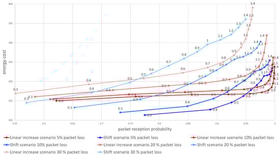 - Reconnection of the device disconnected from the system was performed on simulation made in Microsoft Excel. We created two sheets, one with 140 thousand rows and the second with one million rows (each row represents one device), performing thorough research covering a multitude of independent time skew possibilities. Each row consists of time skew values for 3 consecutive transmission intervals calculated according to a normal distribution (see Section 3.2); qualification formulas to determine if the time burdened with transmitter crystal skew is inside a window range; energy consumption formulas to calculate overall cost for transmission reception.