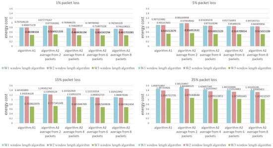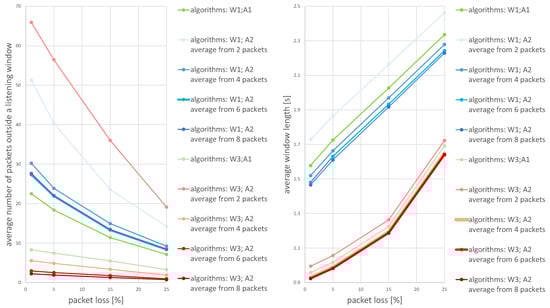 - An algorithm of receiver time synchronization based on the statistics from the N most recent received transmissions (A2)The expected time of arrival of the next packet is determined on the basis of the receiver’s clock (the degree of desynchronization of the receiver’s clock towards the transmitter changes with the passage of time) and the calculated period after which the next transmission will occur: . The algorithm recalculates the interval I, the value of which is added to the expected time of arrival of the next packet . The interval is determined according to the formula:where, and is the time when i-th message actually arrives at the receiver.