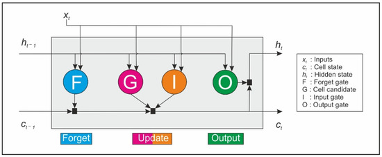 The cell state and the hidden state are the main properties of this type of network. These properties are sent forward from one memory block to the next one. At time t, the hidden state (ht) represents the LSTM layer’s output for this specific time step. The cell state constitutes the memory that contains the information learning from the previous timestamps. Data can be added or eliminated from this memory employing the gates. The forget gate F controls the connection of the input (xt) and the output of the previous block (hidden state ht−1) with the cell state received from the previous block (ct−1). Then it selects which values from ct−1 must be retained and which ones discarded. After that, the input gate decides which values of the cell state should be updated. The cell candidate then creates a vector of new candidate values, and the cell state is updated, producing ct. Finally, the outputs of the memory block are calculated in the output gate. All this process can be formulated as described in Equations (1)–(5) [47].