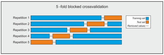 In this work, a 5-fold blocked cross volition method was followed. This method allowed us to determine the hyperparameters of the ANN y LSTM-CVT models (in this last case, in conjunction with the Bayesian optimization technique, see Section 4). A representation of this scheme is presented in Figure 4 [52].