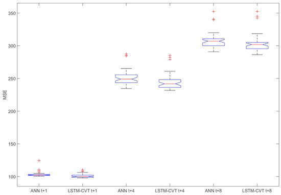 In this study, ANNs, sequence-to-sequence LSTM and the proposed LSTM-CVT method were used to predict the NO2 concentration levels in the EPS Algeciras monitoring station (see Table 2 and Figure 1). The following prediction horizons were used to create the forecasting models: t + 1, t + 4, and t + 8. Additionally, two different approaches were followed in the model’s creation regarding the initial input data used: using only the NO2 data from the EPS Algeciras station (univariate dataset) or using all the available data (exogenous dataset). This second possibility includes all the 77 variables listed in Table 1 (NO2 and other pollutants (NOx, SO2, O3) from EPS and the remaining stations and several meteorological variables). As was mentioned in Section 2, the database included hourly measures from January 2010 to October 2015. As the first step for both approaches, all the dataset was preprocessed and standardized.