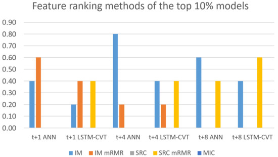 - As a next step, several feature ranking methods were applied to the elements of Pws in the training subset. The feature ranking methods applied were: mutual information, mutual information using the minimum-redundancy-maximum-relevance algorithm, Spearman’s rank correlation, a modified version of the previously mentioned algorithm using Spearman’s rank correlation, and maximal information coefficient (see Section 3.4). The objective was to select the most relevant among the lagged variable concerning the output variable . The selected lagged variables of the training set were included in the set, where fr indicates the feature ranking method applied and per corresponds to the percentage of lagged features selected. Thus, only a small portion of the potential lagged variables was chosen to be finally included as a column in the dataset (the top 5%, top 10% and top 15% variables). Once the ranking and selection process was completed, the same selection criteria were applied to the test set, obtaining the set.
