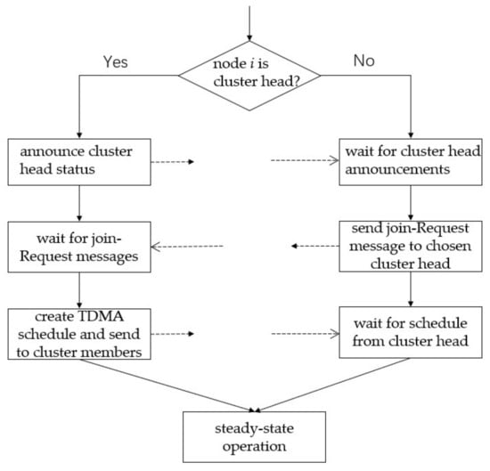 where p is the desired cluster head ratio, r is the current number of rounds, and G is the set of nodes that have not served as a cluster head in the recent 1/p round. In the steady-state phase, TDMA is used in the cluster to avoid data conflicts, and CDMA is used between clusters to avoid transmission conflicts between clusters []. The cluster heads create a TDMA schedule and allocate time slots to each common node. Common nodes transmit data to cluster heads in their allocated transmission time slot. Cluster heads collect and fuse the data from common nodes and send the fused data to BS. In this way, LEACH can reduce network energy dissipation and prolong network lifetime. Figure 1 shows the steps of LEACH. LEACH-C [] uses a centralized clustering algorithm and the same steady-state protocol as LEACH. During the set-up phase, each node sends information about its location and residual energy to BS. BS calculates the average energy of the nodes, and the node whose remaining energy is lower than the average energy cannot be selected as a cluster head. BS runs the simulated annealing algorithm to determine the cluster heads in each round. The simulated annealing algorithm minimizes the total sum of squared distances between common nodes and the cluster heads to reduce energy dissipation.
