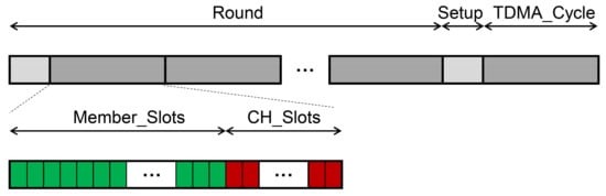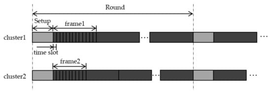 is the time of a round, a given priori value. is the time of the set-up phase, also a given value. x is the number of frames in a round, that is to say, the steady-state phase consisted of x frames. Since the size of each cluster was different, the TDMA cycle of each cluster was different, and the number of frame x was also different. The round and TDMA schedule of two clusters are shown in Figure 2.