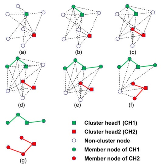 The clustering process of the multi-start minimum spanning forest algorithm is shown in Figure 4. In the figure, squares represent cluster heads, hollow circles represent nodes, which have not joined a cluster, and solid circles represent nodes that have already joined a cluster. There are two starting points at the beginning as Figure 4a. By comparing the relay costs, each time a node, which has entered a cluster selects a node, which has never entered the cluster as its relay node and joins the cluster as Figure 4bβg. Six times later, all six non-cluster head nodes join the clusters and two disjoint clusters are formed as Figure 4g.