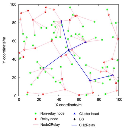 In the phase of multi-hop transmission between clusters, with the BS as the only starting point and the cost of Equation (16) as the edge weights, a tree network between the cluster heads can be generated. The overall topology of the network is shown in Figure 5.