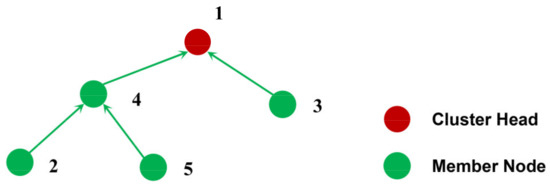 As shown in Figure 6, a cluster contains five nodes, of which node 1 is the cluster head, node 3 directly sends data to the cluster head, and nodes 2 and 5 need to relay through node 4 to forward data to the cluster head.