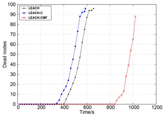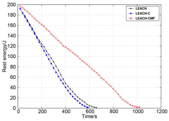 Figure 10 shows the change of the total residual energy. From this figure, it can be observed obviously that LEACH-CMF had better performance. The residual energy of LEACH and LEACH-C dropped significantly more sharply, which means that the two protocols consumed more energy in the routing process. The energy dissipation of LEACH-CMF occurred more slowly than the other two methods. LEACH-CMF greatly shortened the communication distance and achieved the purpose of reducing energy consumption.