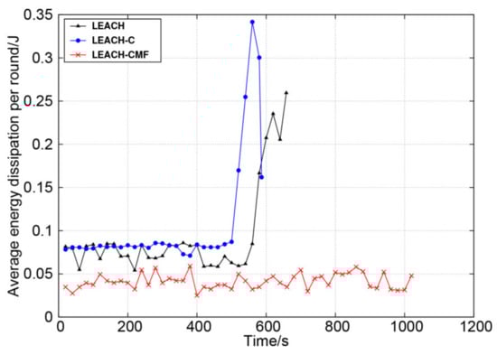 Figure 11 shows the change of average node energy dissipation for each round. As can be seen from the figure, LEACH and LEACH-C consumed more energy each round and the increase was obvious at the later stage, reflecting the unstable network performance. LEACH-CMF maintained long-term low energy dissipation and the overall change was small, reflecting stable network performance. Obviously, LEACH-CMF balanced network load efficiently.