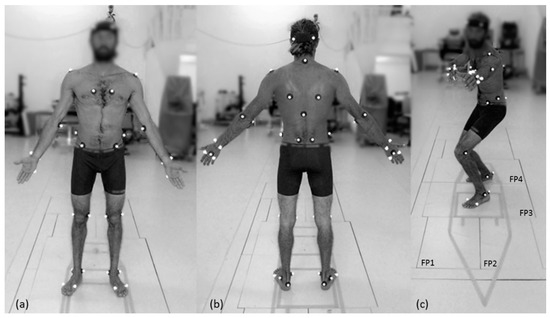 A 12-camera digital motion-capture system (mocap) (Qualisys, Gothenburg, Sweden) was used to record three-dimensional movement of the participants at a 200 Hz sampling frequency. A volume of approximately 45 m3 (5 m long, 3 m wide, and 3 m deep) was calibrated using an L-shaped reference structure and wand according to the manufacturer’s recommendations (0.7 mm standard deviation error calibration mean). Spherical retro-reflective markers were attached to the skin by double-faced adhesive tape, and clusters were fastened with an elastic strap. The full-body model consisted of 46 markers at the following anatomical locations (Figure 1): right anterior head, left anterior head, right posterior head, left posterior head, right acromion, left acromion, right lateral epicondyle, left lateral epicondyle, right medial epicondyle, left medial epicondyle, right styloid process of ulna, left styloid process of ulna, right styloid process of radius, left styloid process of radius, right second metacarpal head, left second metacarpal head, right third metacarpal head, left third metacarpal head, right fifth metacarpal head, left fifth metacarpal head, right scapula inferior angle, left scapula inferior angle, right sternum, left sternum, seventh cervical spinal process, tenth thoracic spinal process, right anterior superior iliac spine, left anterior superior iliac spine, right posterior superior iliac spine; left posterior superior iliac spine, right medium iliac spine, left medium iliac spine, right medial knee (medial epicondyle of the knee), left medial knee (medial epicondyle of the knee), right lateral knee (lateral epicondyle of the knee), left lateral knee (lateral epicondyle of the knee), right lateral malleolus, left lateral malleolus, right medial malleolus, left medial malleolus, right first metatarsal head, left first metatarsal head, right fifth metatarsal head, left fifth metatarsal head, right calcaneus, and left calcaneus.