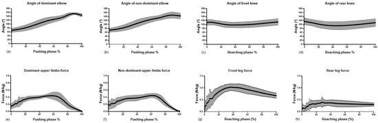 Average and standard deviation of kinematic and force variables during the pop-up. The first line shows (a,b) as the dominant and nondominant elbows angle during the pushing phase; (c,d) are, respectively, the front and rear knee angle during the reaching phase. On the second line, (e,f) show the dominant and nondominant upper-limb ground reaction forces during the pushing phase, while (g,h) show the front and rear leg ground reaction forces.