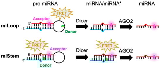 Kamiya, Y.; Kamimoto, H.; Zhu, H.; Asanuma, H. Development and Modification of Pre-miRNAs with a FRET Dye Pair for the Intracellular Visualization of Processing Intermediates That Are Generated in Cells. Sensors 2021, 21, 1785. https://doi.org/10.3390/s21051785