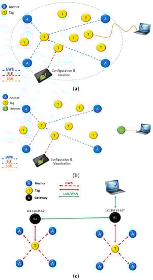 - There is a centralized access to all tag positions, but not ranges. There is no centralized place where the ranges of all anchors-to-tags are received. That is, if we want to receive all the range information, we must ask each of the tags. The solutions using a listener and gateways (Figure 2b,c) designed to receive a global vision of the network state are restricted to all tags’ positions calculated by the location engine of each tag, but there is no centralized access to all ranges.
