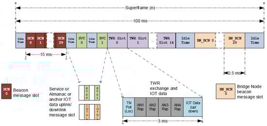A location network based on PANS and DWM1001 modules uses time division multiple access (TDMA). At each instant of time, there is only one tag-anchor pair exchanging messages to measure the round-trip time (Two-Way-Ranging). Nodes operate using a 100 ms long “superframe”. This structure is shown in Figure 3. This TDMA synchronization method is very good to avoid collision, such as happens in ALOHA approaches, and guarantees a predictable scalability of the system to accommodate hundreds of tags [].